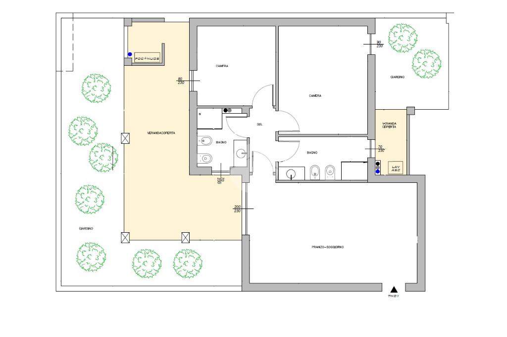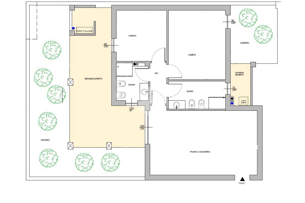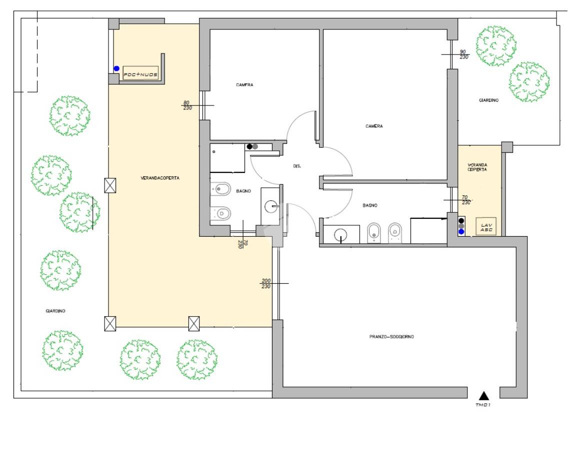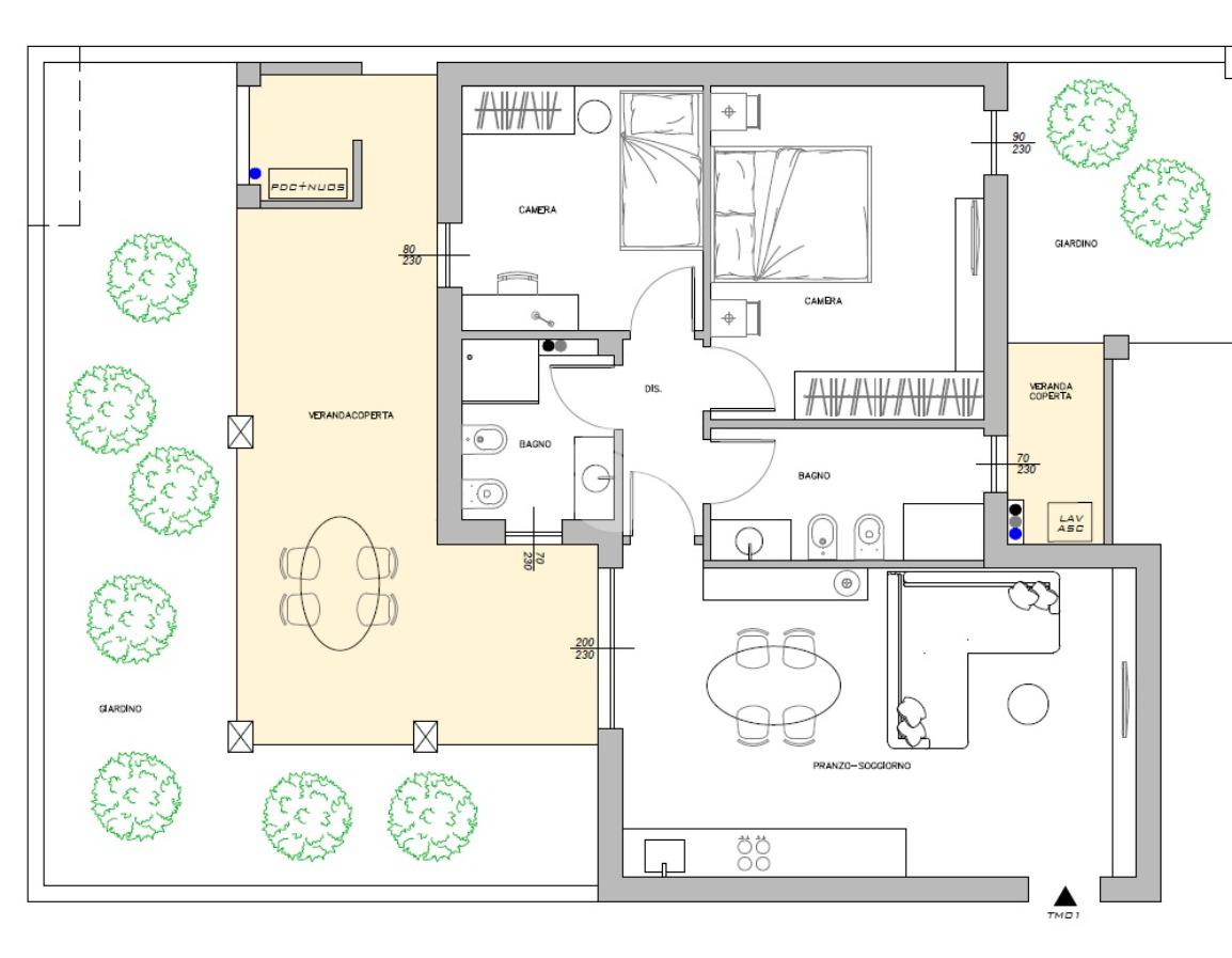 L'appartamento è ideale per chi cerca ampi spazi e pertinenze esterne esclusive ed è composto da ingresso con zona pranzo soggiorno collegata ad un'ampia veranda coperta e al primo giardino, ideale per godere dei momenti di relax all'aperto. Dal disimpegno accediamo al bagno con affaccio su un'ulteriore veranda coperta, alle due camere, di cui la matrimoniale collegata al secondo giardino e al bagno principale.