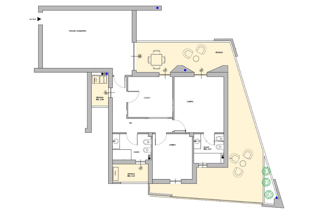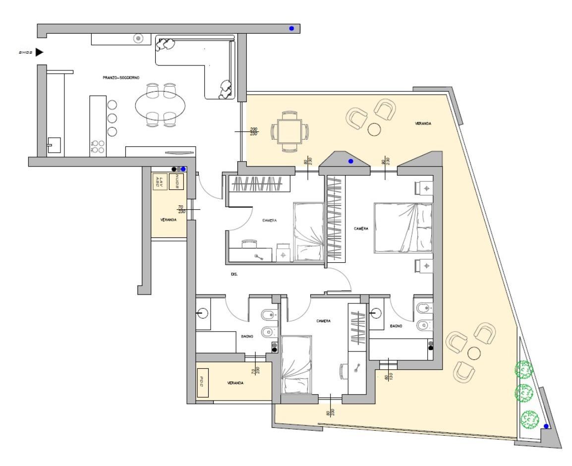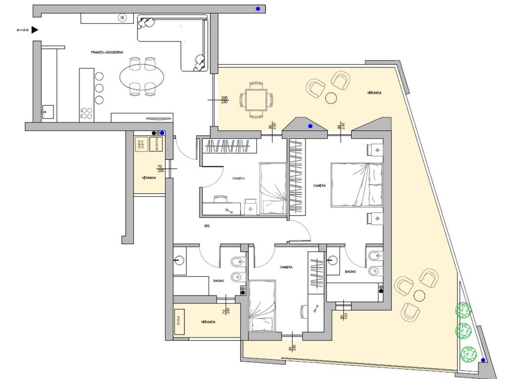 L’appartamento si distingue per l’ampia veranda che si apre sia sulla zona giorno che sulle camere, regalando luminosità e continuità agli ambienti.