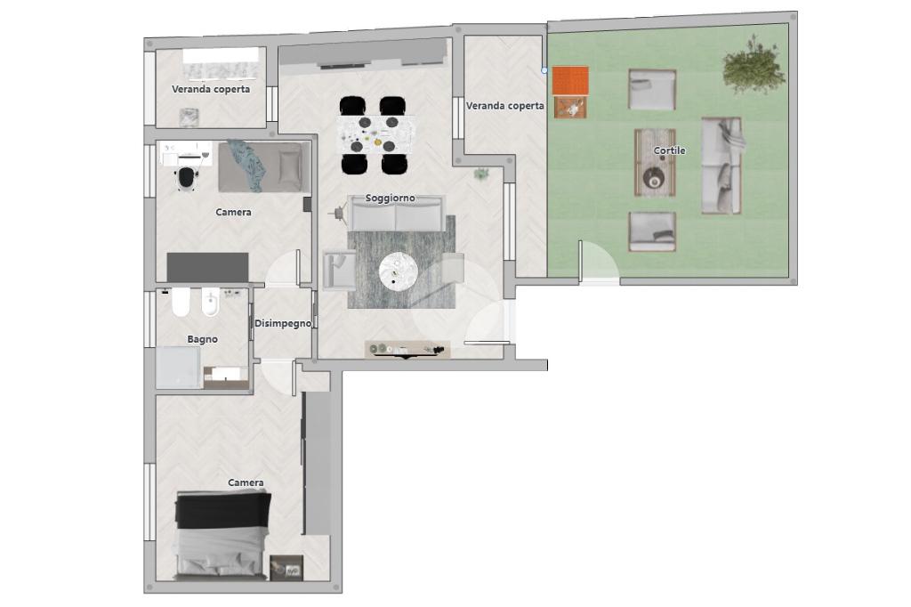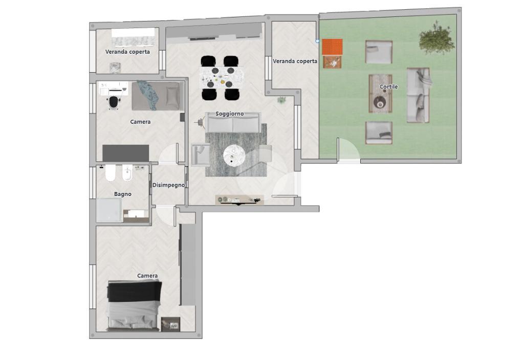 L'unità è caratterizzata da un cortile privato, perfetto per vivere momenti di relax all'aperto. Al suo ingresso presenta la zona pranzo soggiorno con accesso alla veranda e al cortile, il disimpegno ci conduce alle due camere, di cui una matrimoniale e una singola e al bagno. E' inoltre presente un'ulteriore veranda sfruttabile come zona lavanderia.